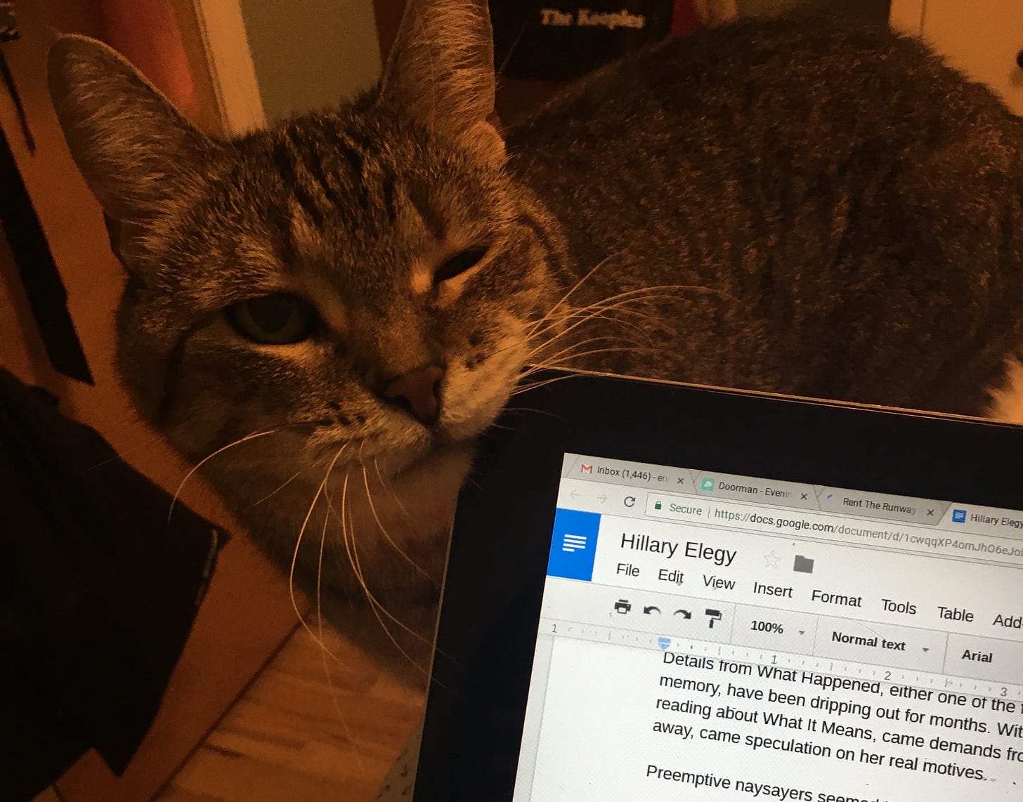 Donald Trump won the election, and the Cat Guy and I stayed up all night discussing moving to Canada while I struggled to meet a deadline. Eleanor was always a nonjudgmental witness to whatever was occurring in her space. As long as people were there to hang out with her, and as long as she had food to eat, she was happy.
