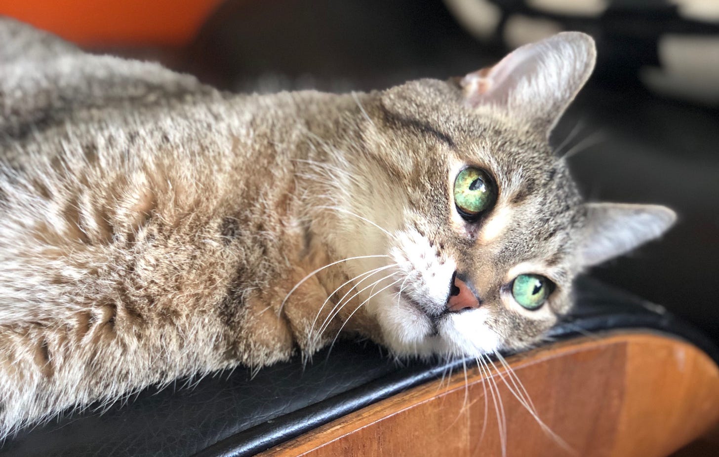 It was not a musical meow— it was raspy and grating (later, I’d call it her “dinosaur meow”), but she was beautiful– a little white-chinned brown tabby with big green eyes, missing one of her front fangs.