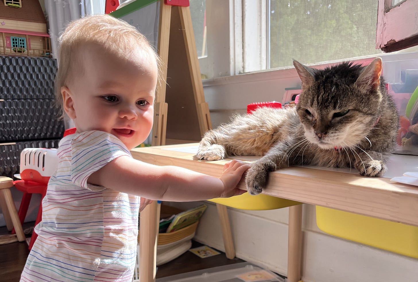 The baby learned the word “gentle.” The cat would sit there nervously while I guided the baby’s hand to her head or back, before deciding that enough was enough and fleeing to higher ground.