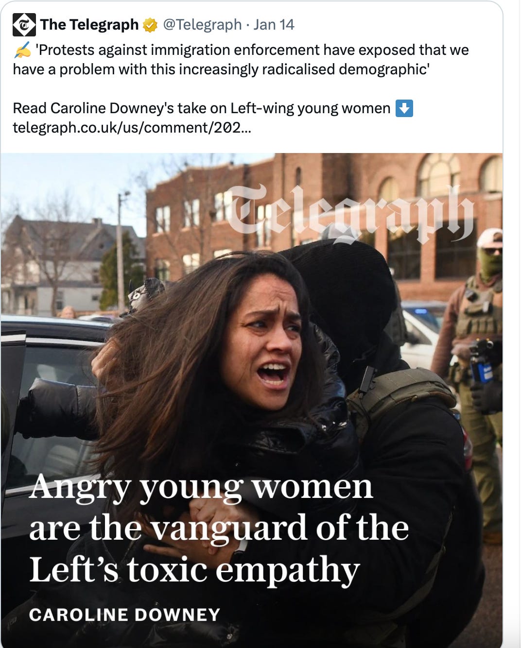 In one particularly egregious example, twentysomething National Review schoolmarm Carolyn Downey, writing for The Telegram, declared “Angry Young Women are the Vanguard of the Left’s Toxic Empathy.” Accompanying the social post of that article is a photo of an unarmed woman being dragged from her car by police. The woman was actually not protesting; as journalist Eric Michael Garcia pointed out on X, the woman in the photo was autistic and trying to get to the doctor, and the officers ripped her from her vehicle and dragged her across the street anyway. (Might want to get in touch with the photo editor about that, CD.)